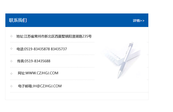 傳真:0519-83435688    郵編:213135    網址:WWW.czjhgj_com.cnmobil.com    電子郵箱:JH@czjhgj_com.cnmobil.com